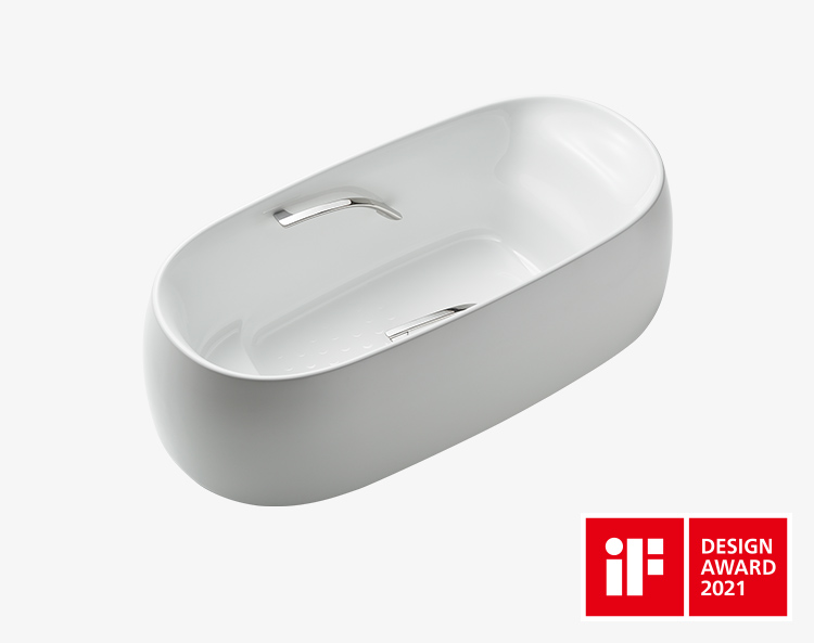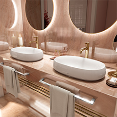Bồn tắm hình bầu dục và bồn rửa mặt hài hòa với thẩm mỹ của nội thất lộng lẫy, làm tăng thêm hiệu ứng tổng thế cho thiết kế.
