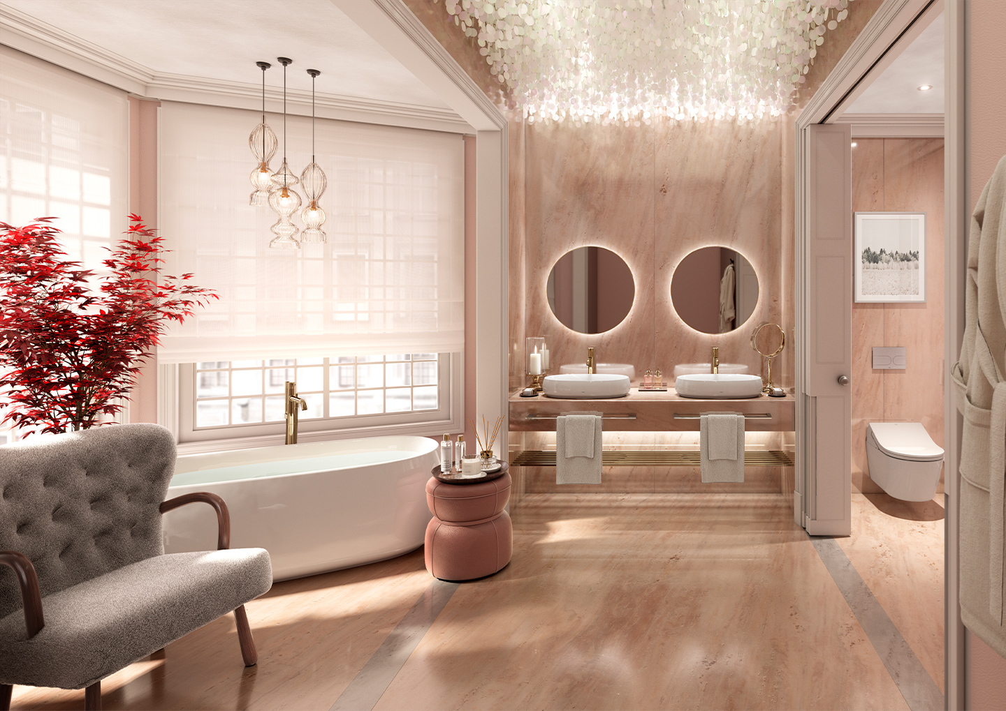 Sàn lát đá cẩm thạch màu hồng phấn, ghế da màu hồng và gương trang điểm tròn có đèn nền sẽ ngay lập tức mang lại cho bạn cảm giác tích cực và sảng khoái.