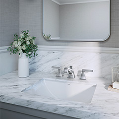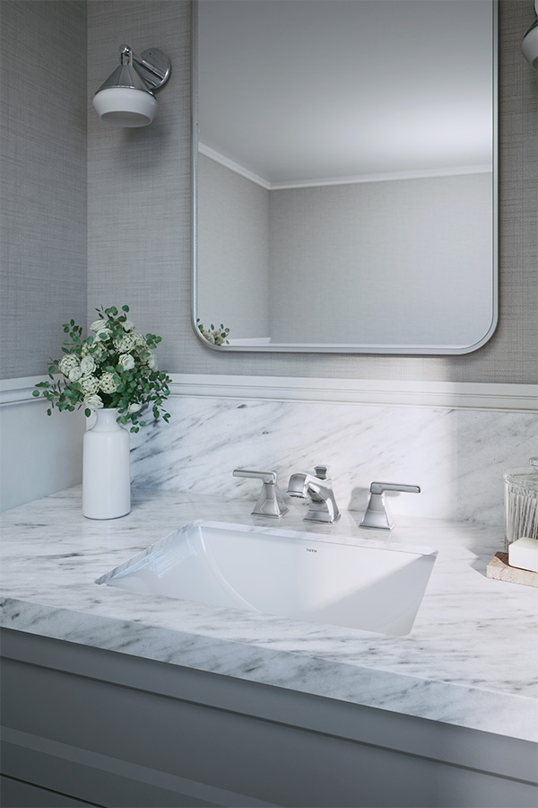 Một công viên ốc đảo đô thị lấp ló sau vánh cửa sổ chớp - một sự tưởng tượng hoàn hảo khi bạn bạn đắm mình vào không gian phòng tắm tân cổ điển này.