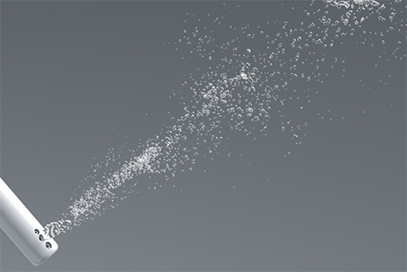 Washing water full of air spurts out of WASHLET’s wand. The shot zooms in on the inside of the wand, showing the structure of the washing water filled with air. A caption is displayed: “The precise, pleasant, air rich stream keeps you clean.And it's always pleasantly warm.” At the end, there is a close-up shot of the washing water spurting out of the wand, expressing the comfort of washing that feels ample even though only a small amount of water is used.